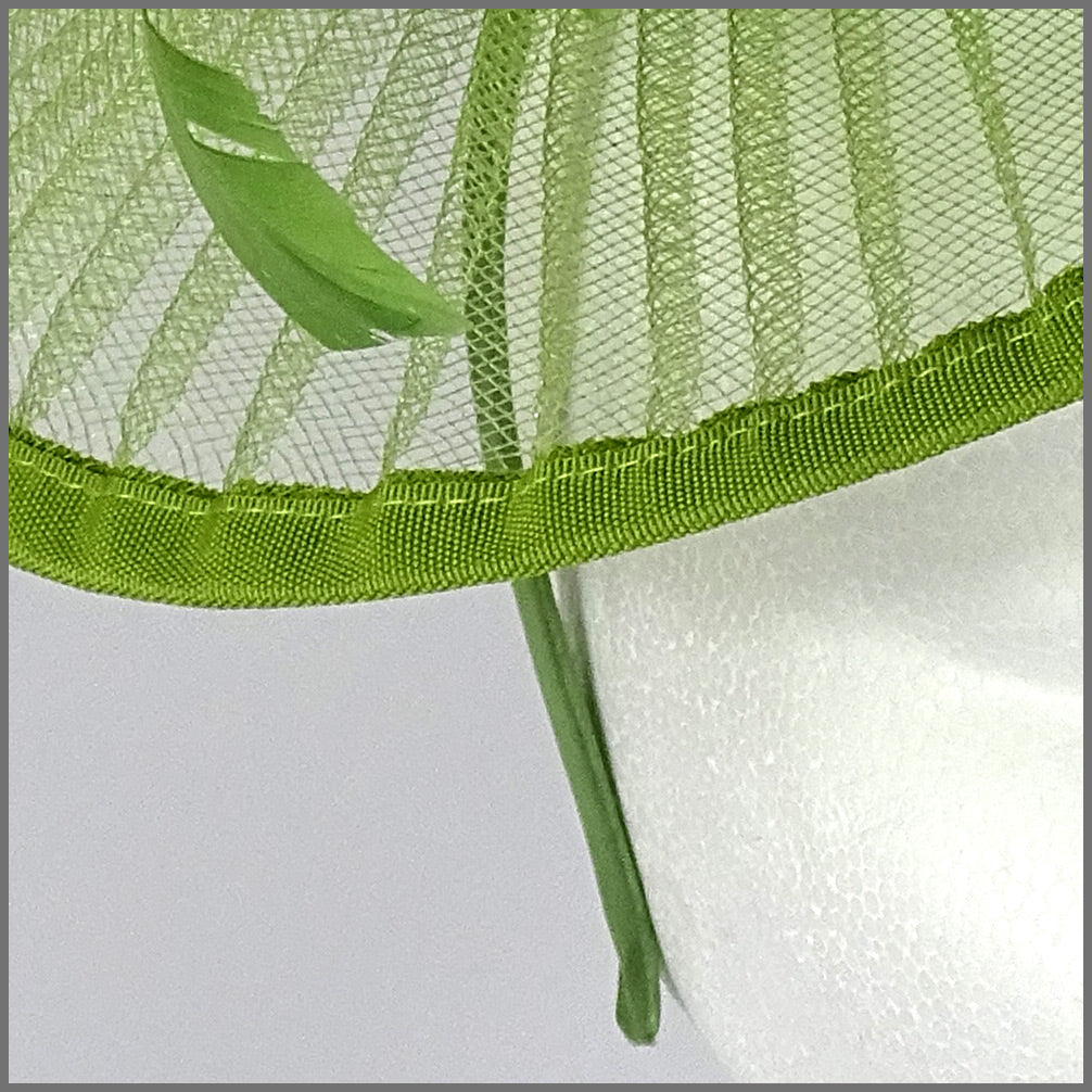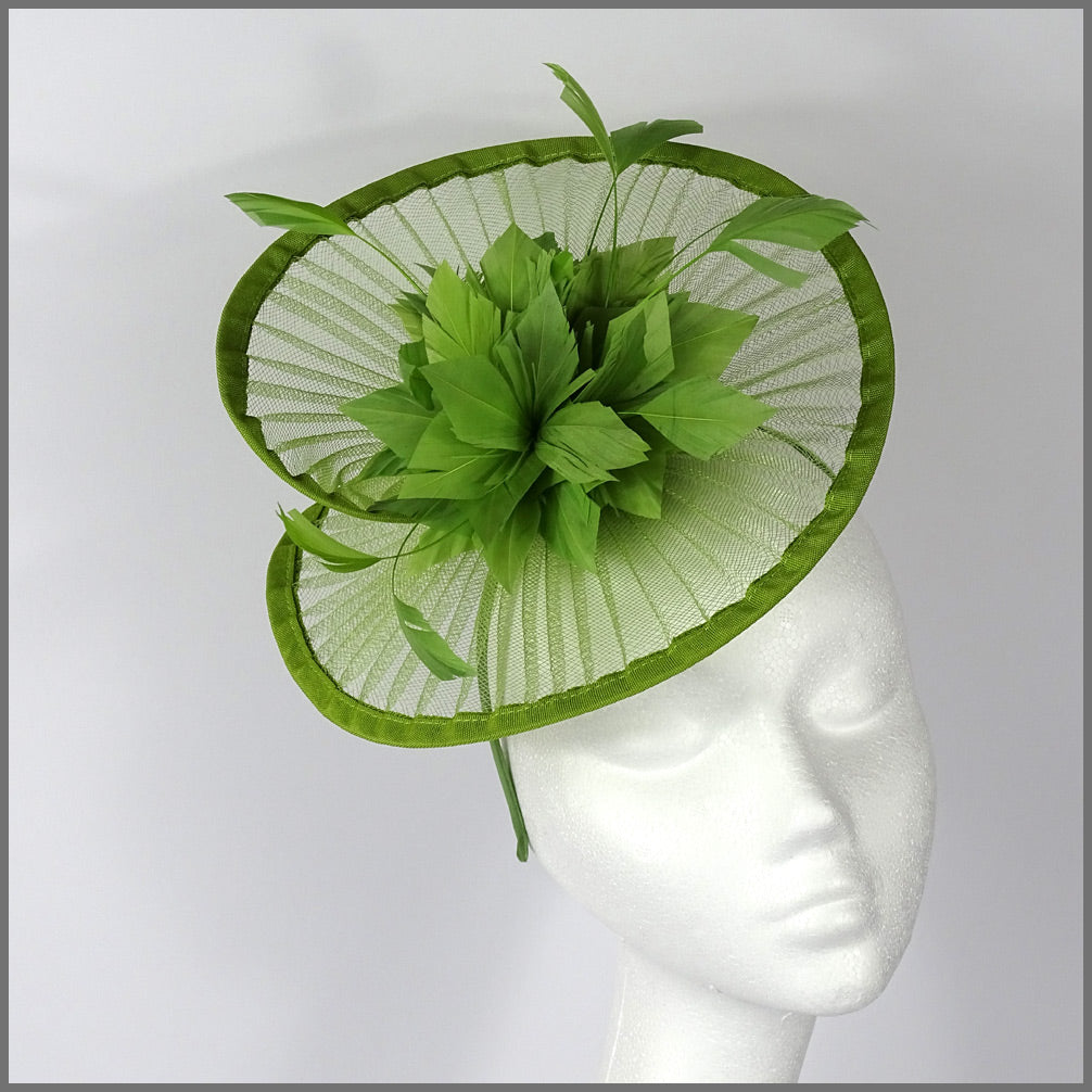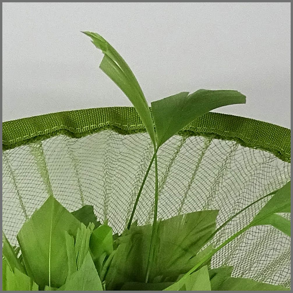 Pretty crinoline split brim disc / hatinator with matching satin edge in sage green. A matching green middle flower and feather sprays complete the design. Made on a headband. Ideal for a weddings, race day or formal event.