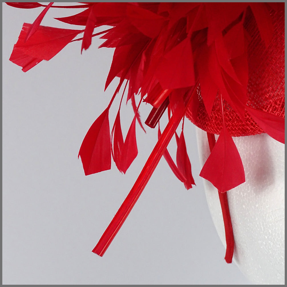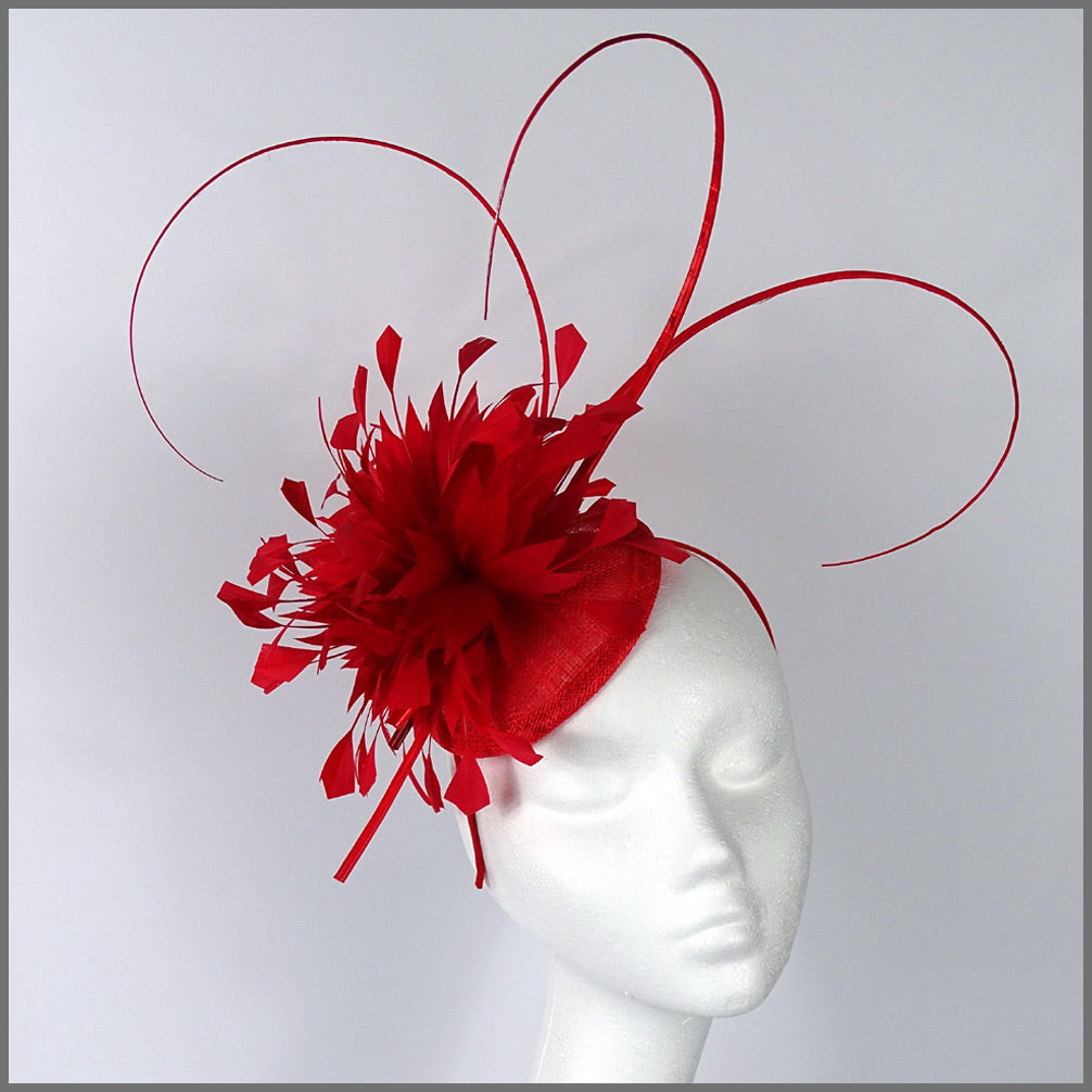 Stunning and unique, this bespoke red feather and ostrich quill fascinator really makes a statement. Feather flower centre with curled quills giving height and elegance. Ideal for weddings and race days alike. Made on a headband.